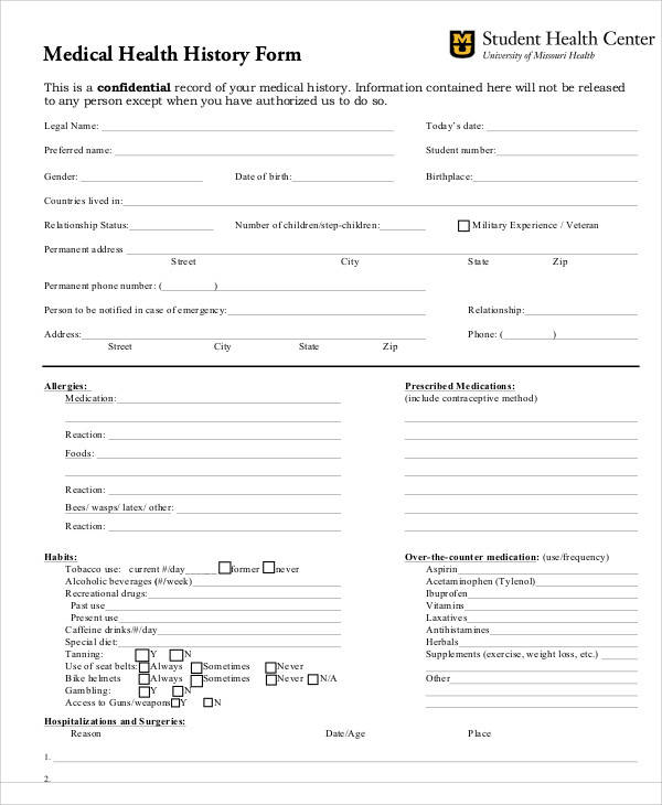 Medical history forms typically include information such as previous medications, treatments,.